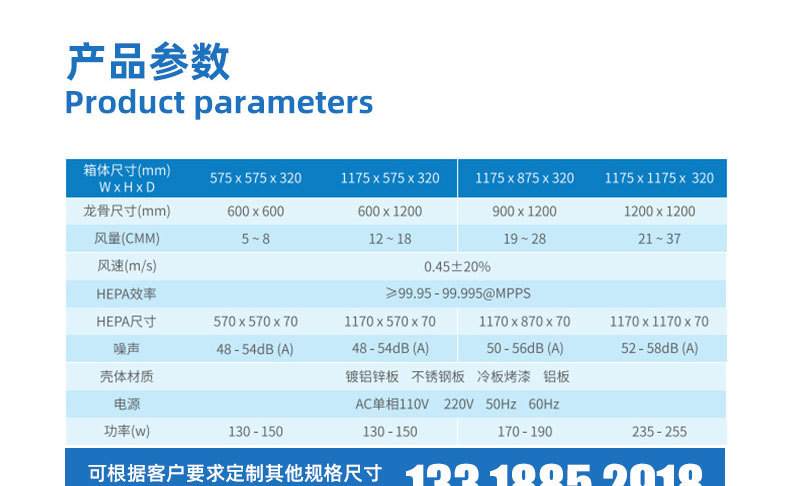 尺寸 | 輸出功率(W) | 額定風量 | 過濾效率(0.3μm) |